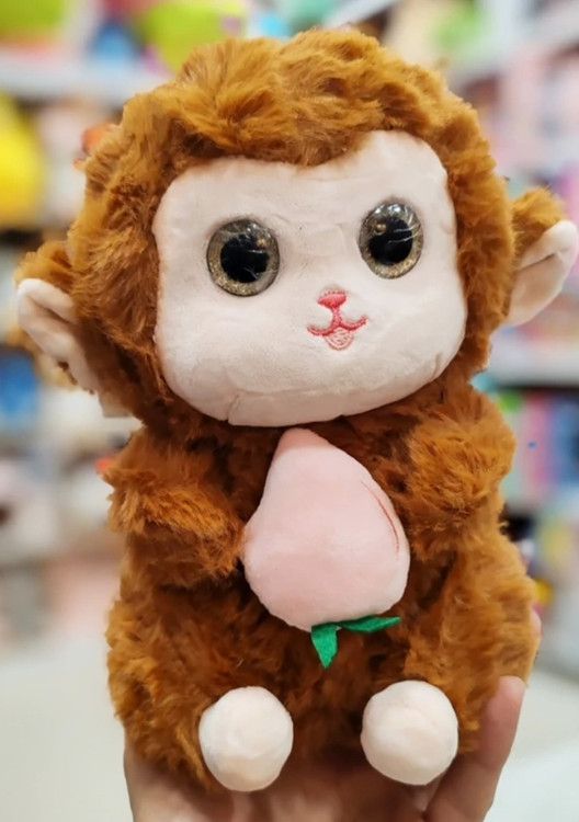 عروسک پولیشی میمون نشسته چشم تیله ای میوه بدست ۲۲ سانتی