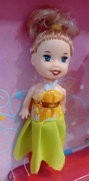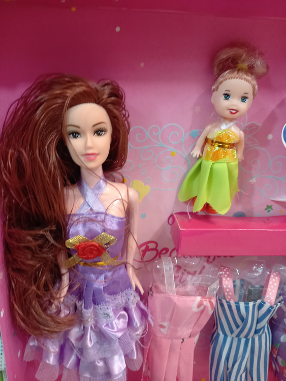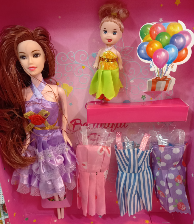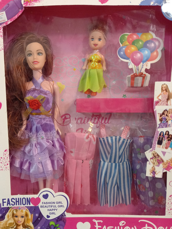 عروسک باربی به همراه بچه و چند دست لباس