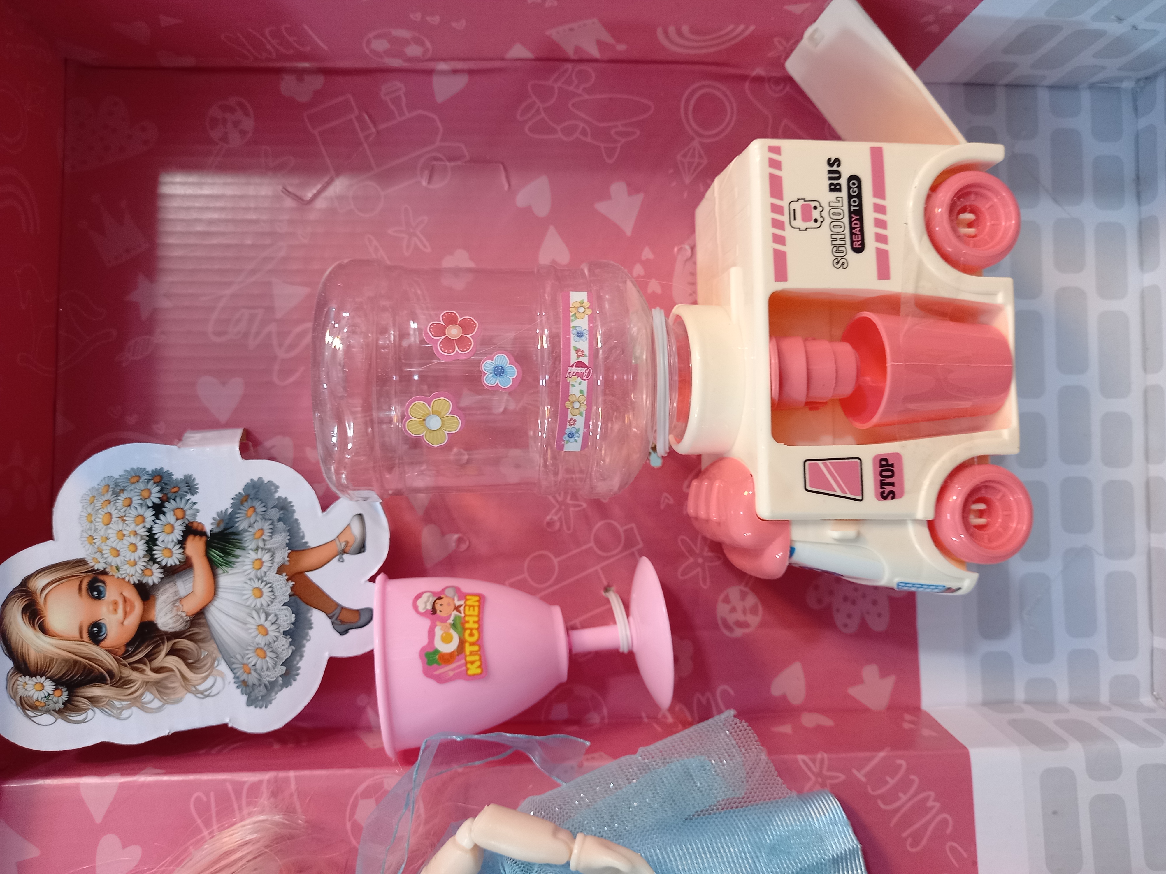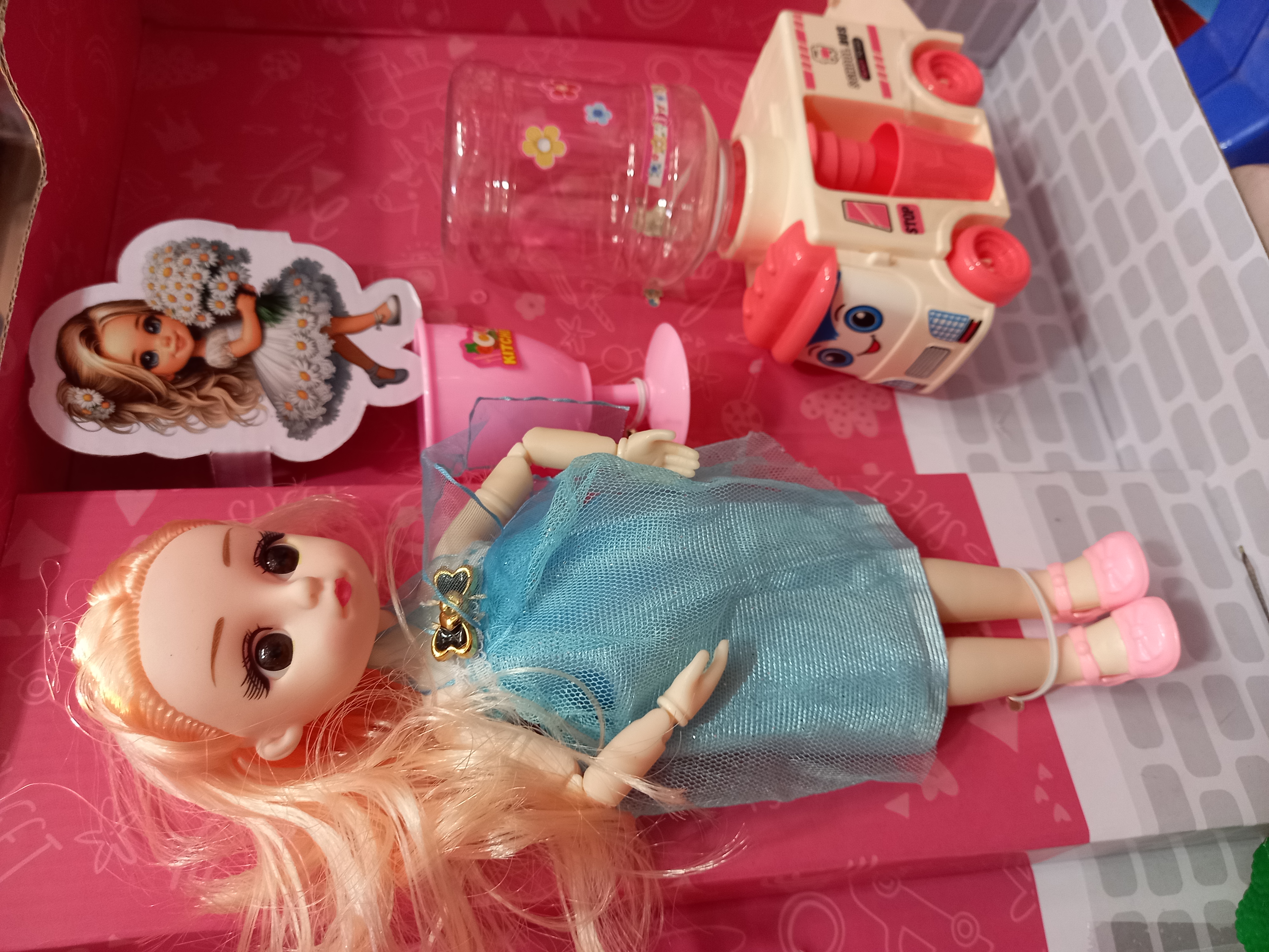عروسک باربی چشم تیله ای مفصلی همراه آب سرد کن و وسایل آشپزخانه