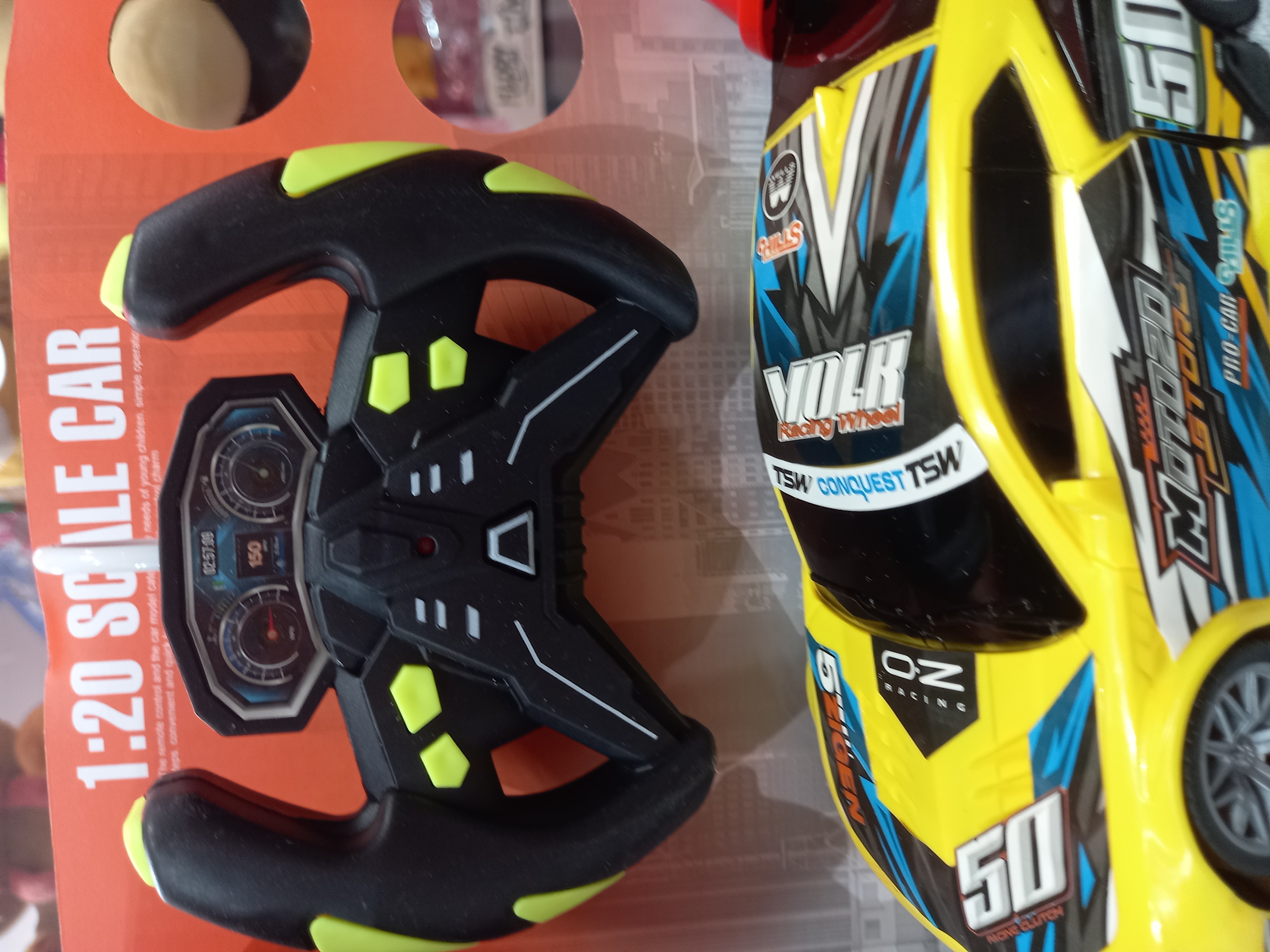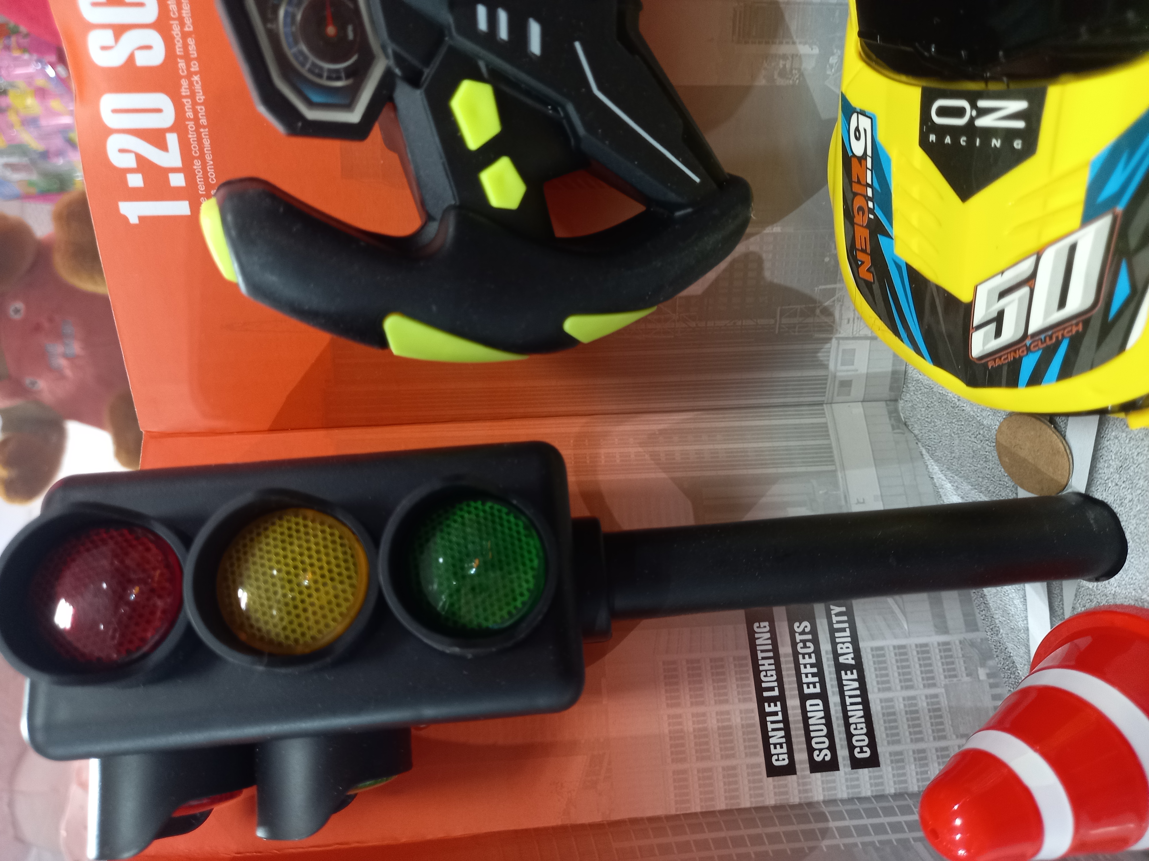 ماشین کنترلی مسابقه ای دارای یک چراغ راهنما است که با فشار دادان دکمه روی چراغ راهنما روشن میشود و چراغ های آن روشن و موقع تغییر رنگ چراغ صدا میدهد.