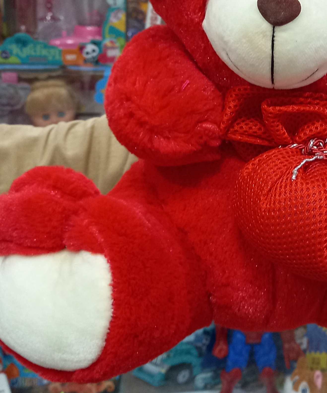 عروسک خرس قرمز کلاه دار بخچه بدست ولنتاینی ۳۵ سانتی