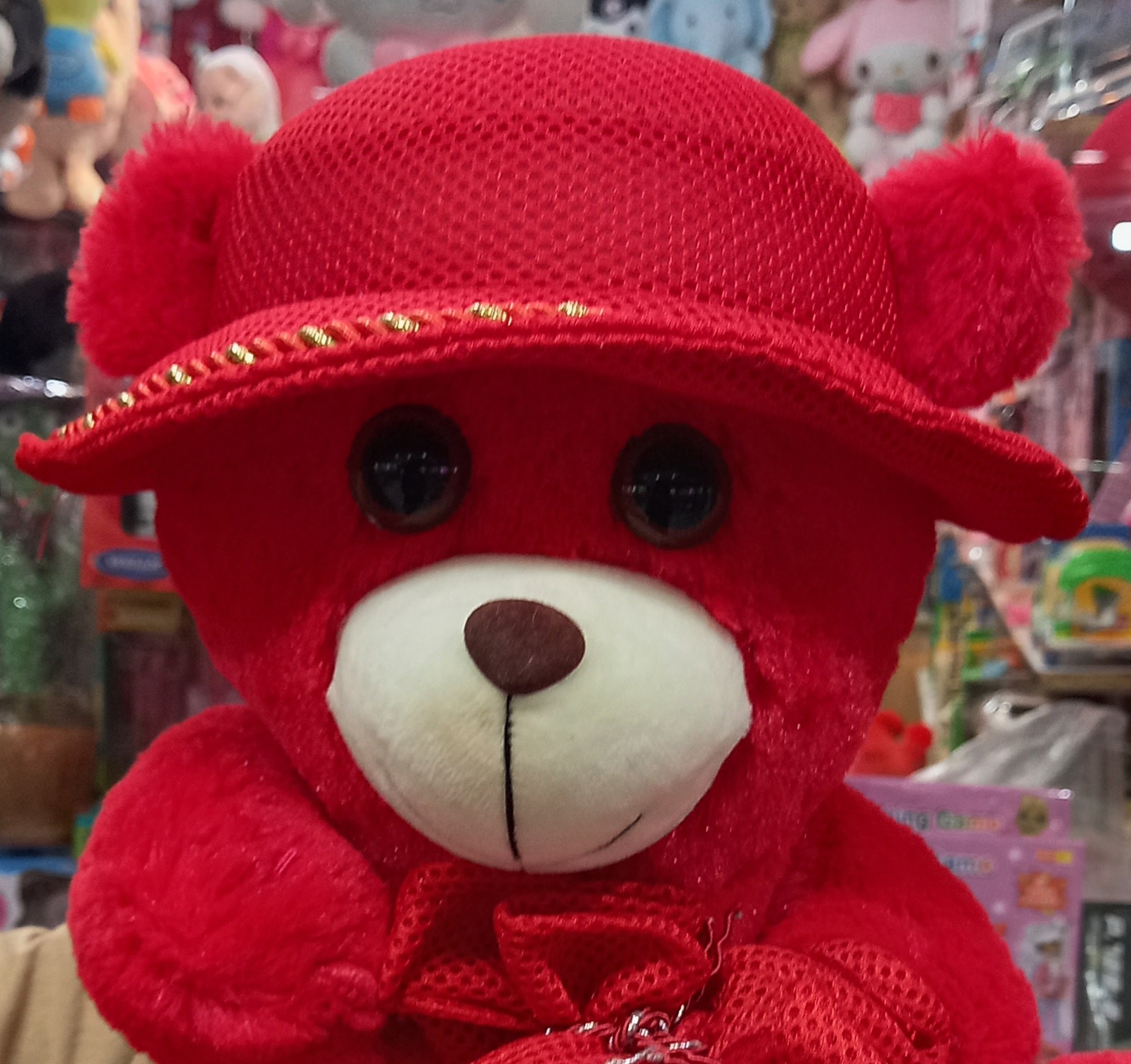 عروسک خرس قرمز کلاه دار دارای جنس بسیار نرم و لطیف میباشد .این محصول قابل شستشو است.