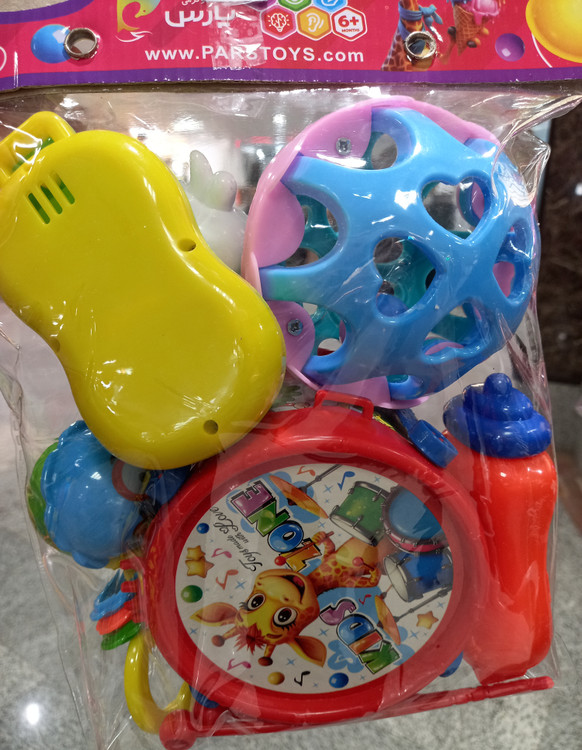 در بستهبندی این محصول ۵ عدد جغجغه و یک عدد طبل، دو عدد چوب طبل است. کودک با استفاده از چوبها بهراحتی میتواند طبل را به صدا در بیاورد و صدای جدید تولید کند. همچنین خلاقیت و آشنایی با حواس نوزادان تقویت میشود