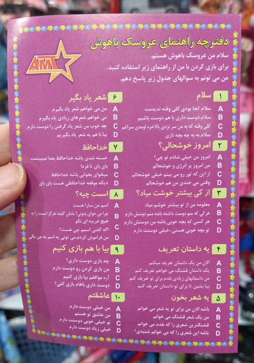 این عروسک دارای یک دفترچه راهنما میباشد و با پرسیدن سوال های روی آن میتواند به هر سوال ۴ پاسخ متفاوت بدهد.